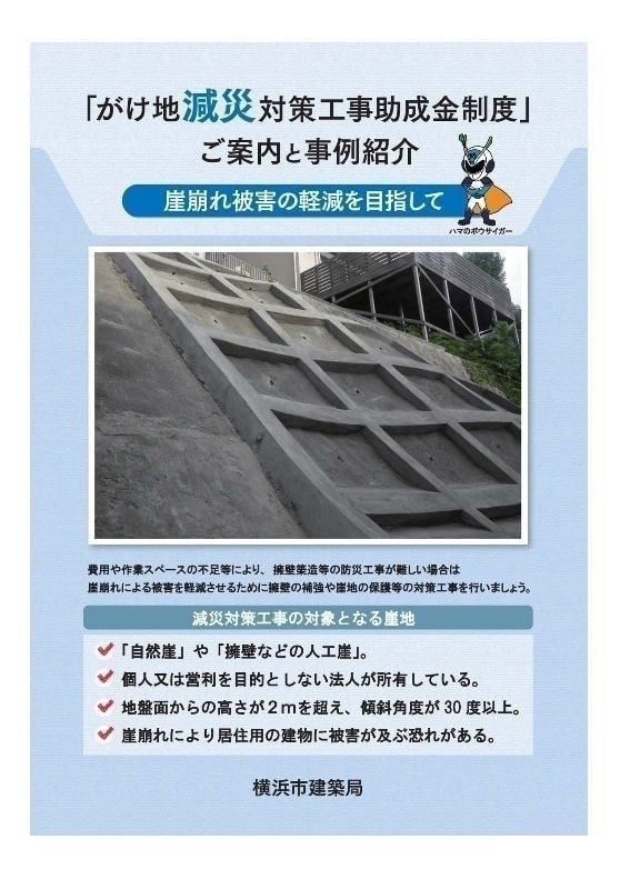横浜市がけ地防災対策工事助成金制度について 以下の項目に該当する崖地が対象となります。 ・市内の一連の崖等で地盤面からの高さが2メートルを超える、個人又は営利を目的としない法人が所有する崖地。 ・崖崩れにより居住の用に供する建築物等に被害が及ぶおそれがある崖地。 横浜市がけ地減災対策工事助成金制度について 横浜市ブロック塀等改善事業 平成30年6月の大阪府北部における地震では、ブロック塀等の倒壊が原因で人命に関わるこのことを受け、横浜市では、地震発生時における歩行者への被害を防止する観点から、新たに市内全域で個人が所有するコンクリートブロック塀等の改善工事を対象とした 補助制度を創設 しました。 注意 事業終了:平成33年度末 狭あい道路拡幅整備事業 狭あい道路とは、幅員が4m未満の 狭い道路です。このような道路は緊急 時・災害時だけでなく、日常生活にも 支障をきたします。 建築基準法では建築物は幅員4m 以上の道路に接している必要がある と規定されており、幅員4m未満の建 築基準法第42条第2項※に規定する道 路(以下「2項道路」)沿いの敷地で建 替えや改築などを行う際は、原則とし て道路の中心から2mを道路とみなし て後退する必要があります。 川崎市補助金制度 宅地防災工事助成金制度 ブロック塀等撤去促進助成金交付要綱 区画道路拡幅整備事業助成金交付要綱 東京都補助金 港区がけ・擁壁改修工事支援事業 品川区道路沿いのコンクリートブロック塀等の除却助成 品川区がけ・擁壁改修工事費助成事業 大田区がけ等の整備工事助成制度 新宿区擁壁及びがけ改修等支援事業 台東区がけ・擁壁の改修工事に対する助成 台東区ブロック塀等の改善工事助成 文京区がけ整備資金助成事業 目黒区がけ・擁壁改修助成制度 杉並区がけ擁壁改善資金の融資 板橋区がけ・よう壁に関する調査結果 ページトップへ 神奈川県県土整備局 建築住宅部建築指導課 横浜市宅地審査部 ( 宅地審査課 ・ 調整区域課 ) 川崎市指導部宅地審査課 東京都市整備局 メニュー04